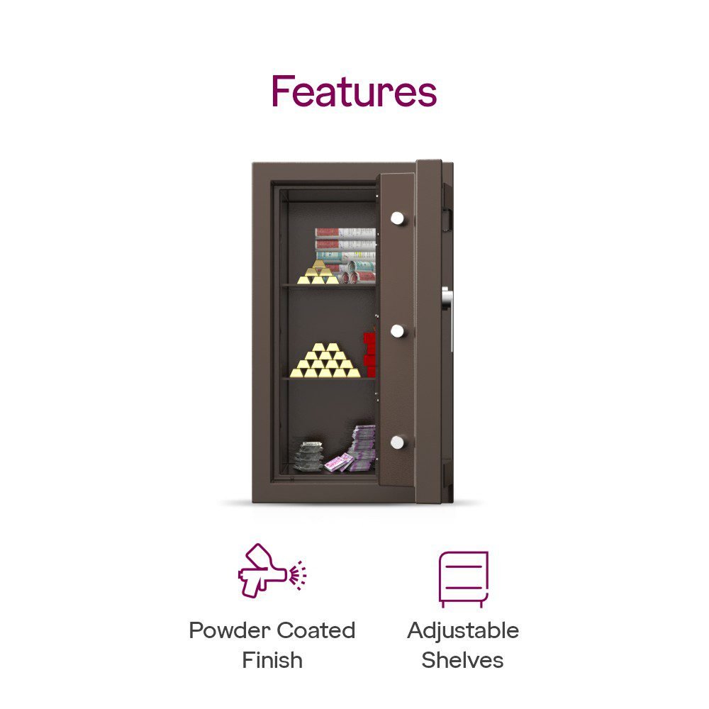 The safe is built using high-grade steel with a corrosion-resistant coating suitable for humid coastal climates. It includes a V6 series reinforced door, precision-engineered key lock mechanism, and durable internal shelving. The structure supports anchoring to the floor or wall for added stability. The premium coffee brown exterior finish enhances aesthetic appeal while maintaining scratch resistance.