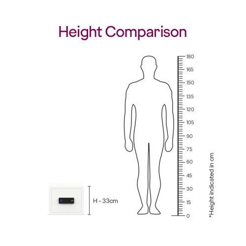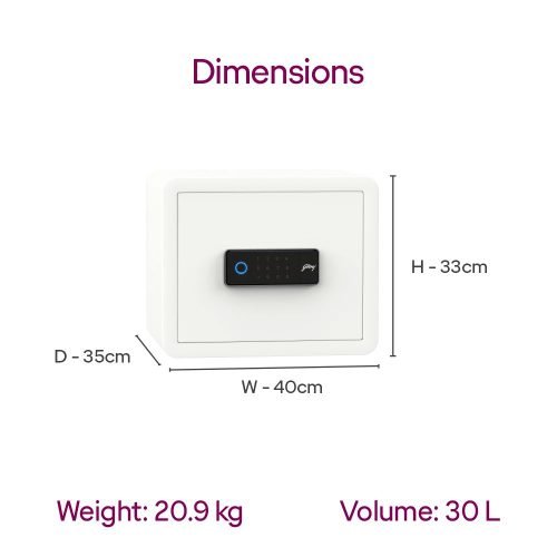 The locker features a 30-litre internal capacity suitable for jewellery, documents, cash, and small personal valuables. It includes both biometric fingerprint scanning and a secure digital keypad locking system. The heavy-duty steel construction ensures durability and strength for everyday use. The surface finish resists scratches and maintains a neat look over time. Battery-powered electronics ensure consistent performance without complicated wiring, and internal shelves help organise stored items.