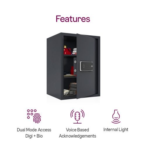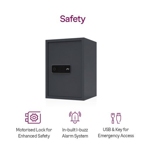 This locker comes with biometric access for quick and secure entry, supported by a digital PIN system. The spacious internal layout allows neat storage of jewellery, documents, and personal valuables. Reinforced steel construction adds strength against forced entry. Smooth door operation and user-friendly controls make daily usage effortless. Buyers enjoy enhanced security, convenience, and peace of mind backed by a trusted Indian brand.