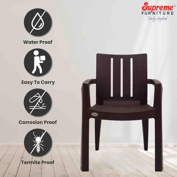 The Supreme Kent Plastic Chair features a unique wooden look with a premium matt finish and semi-gloss texture. The chair is designed with arms for added comfort and is suitable for both indoor and outdoor use. Its heavy-duty build ensures it can withstand regular use in any environment.